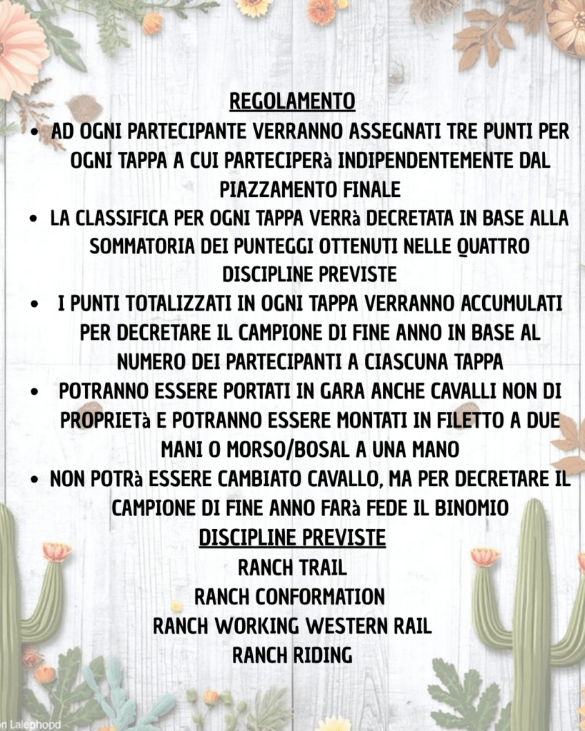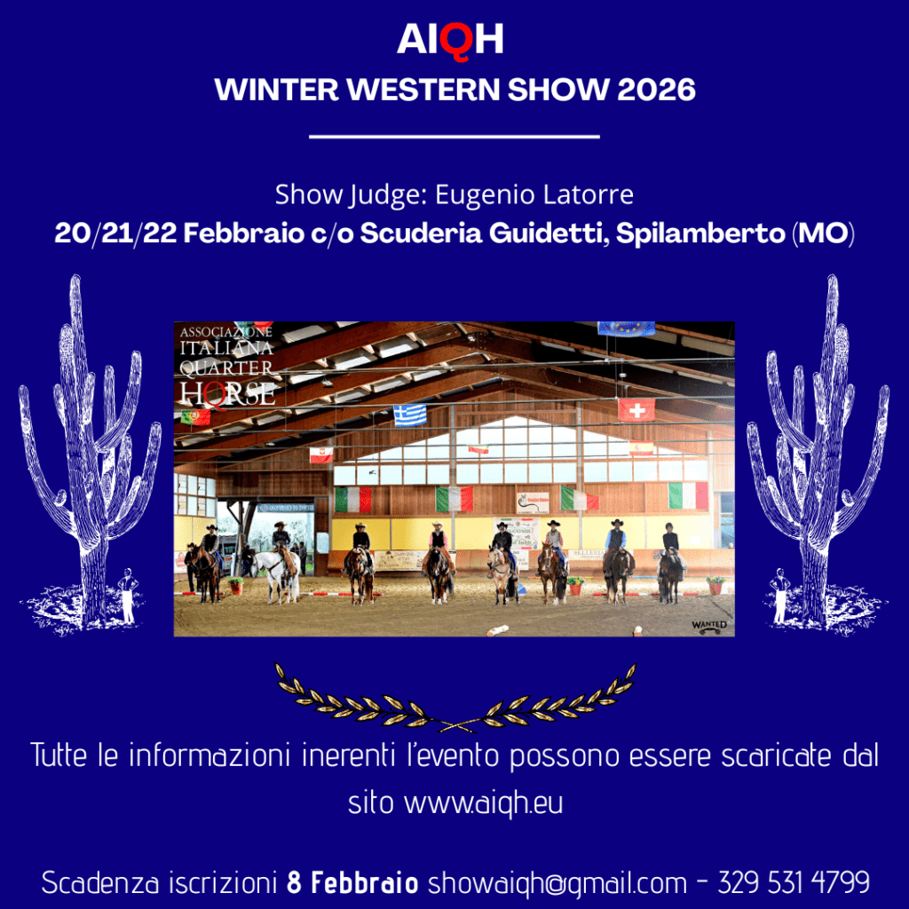 L’AIQH Winter Western Show si terrà presso la Scuderia Guidetti di Spilimberto, Modena, nel giorni 20,21,22 Febbraio 2026. Si tratta di uno show AQHA approved con giudice singolo. Durante l’evento è inoltre previsto il trofeo Best Ranch Horse.
